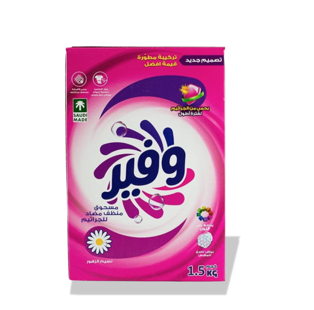 استمتع بنظافة فائقة وحماية متكاملة لملابسك مع مسحوق غسيل وفير المضاد للجراثيم. يتميز هذا المسحوق بتركيبته القوية التي تحتوي على تقنية "الأكسجين النشط X2" التي تعمل على إزالة أصعب البقع والدهون بفعالية عالية، مع الحفاظ على الألوان ناصعة بفضل تقنية "برايت جارد".